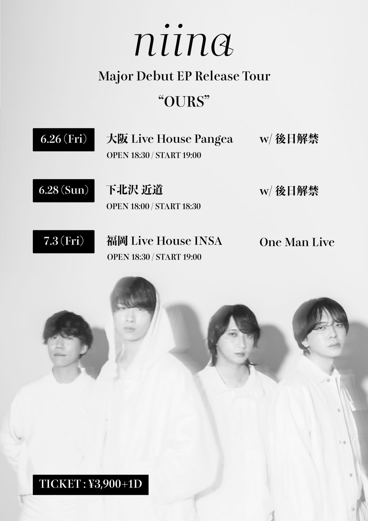 ~4/12(日)23:59今回はバンド体制になり、初リリースとなる Major Debut EP「OURS」を引っ提げて大阪、東京、福岡の3都市でツアーを開催。東京・大阪公演はゲストを迎えてのツーマン、地元 福岡公演はワンマンでの開催を予定!